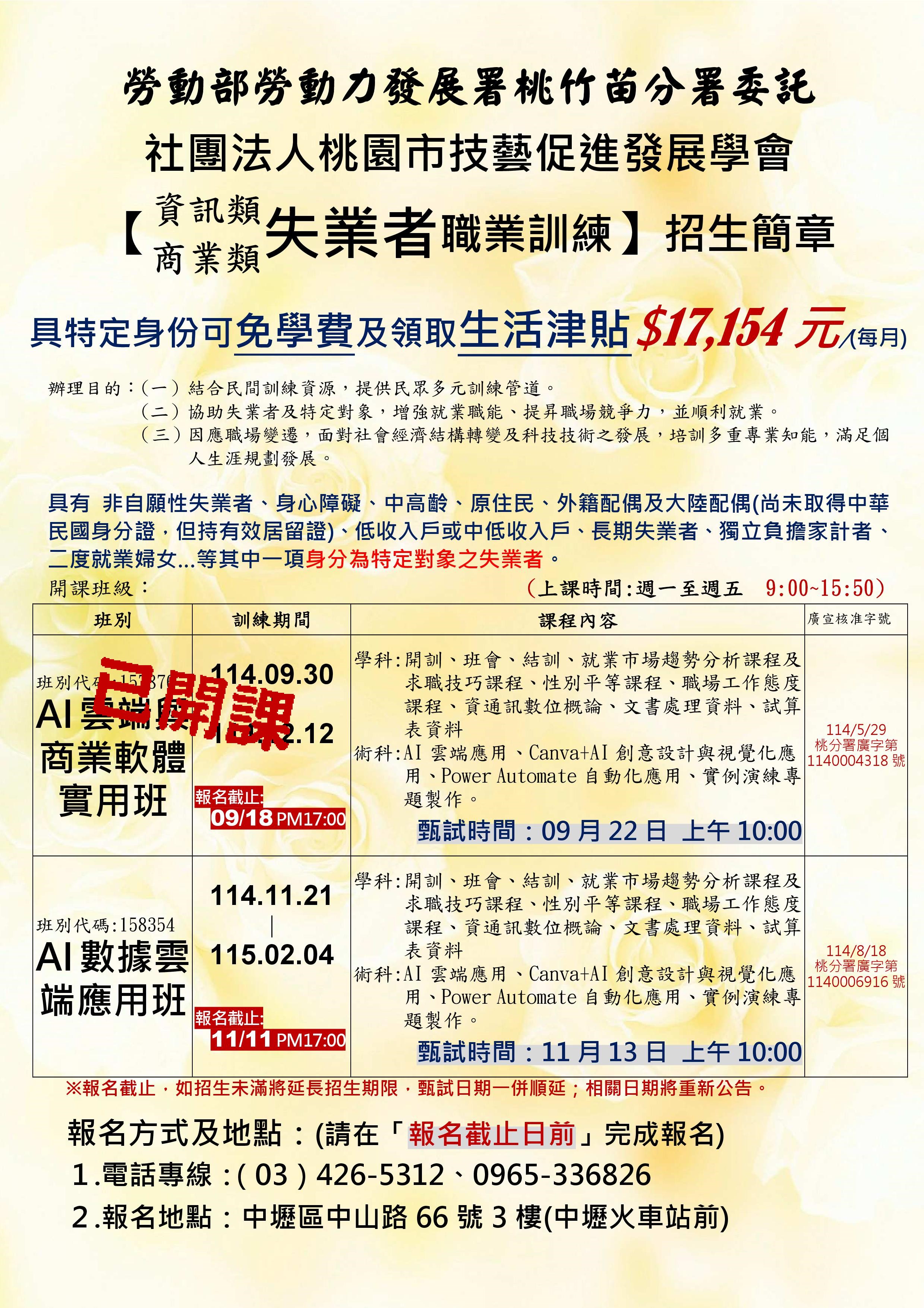 | 114-07-19 | 114年失業者職前訓練『AI雲端與商業軟體實用班』招生中...