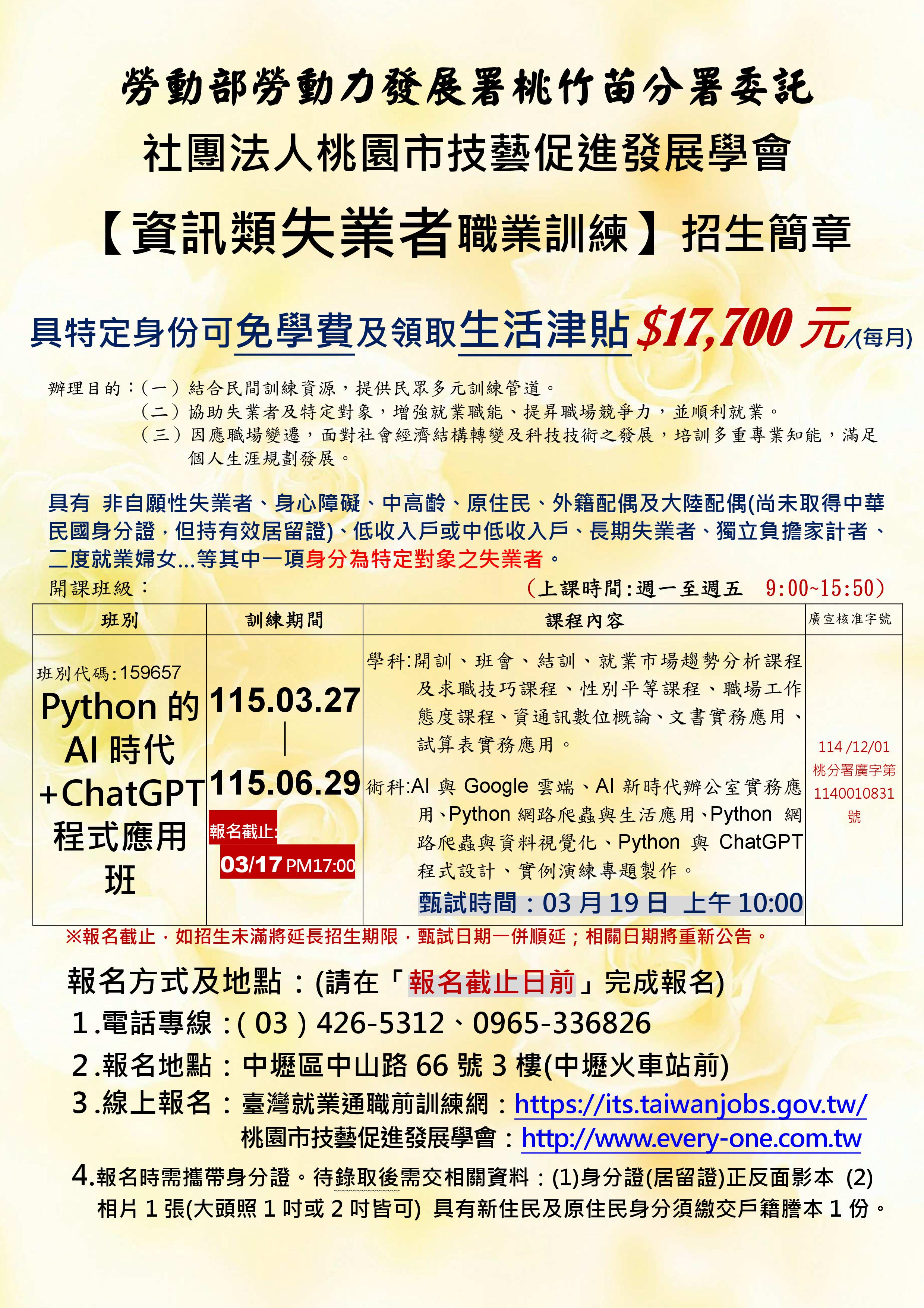 訓練期間從115/03/27~115/06/29,報名截止日期為115/03/17 下午5點止。 欲參訓者請儘快報名喔!03-4265312、0965-336826 |