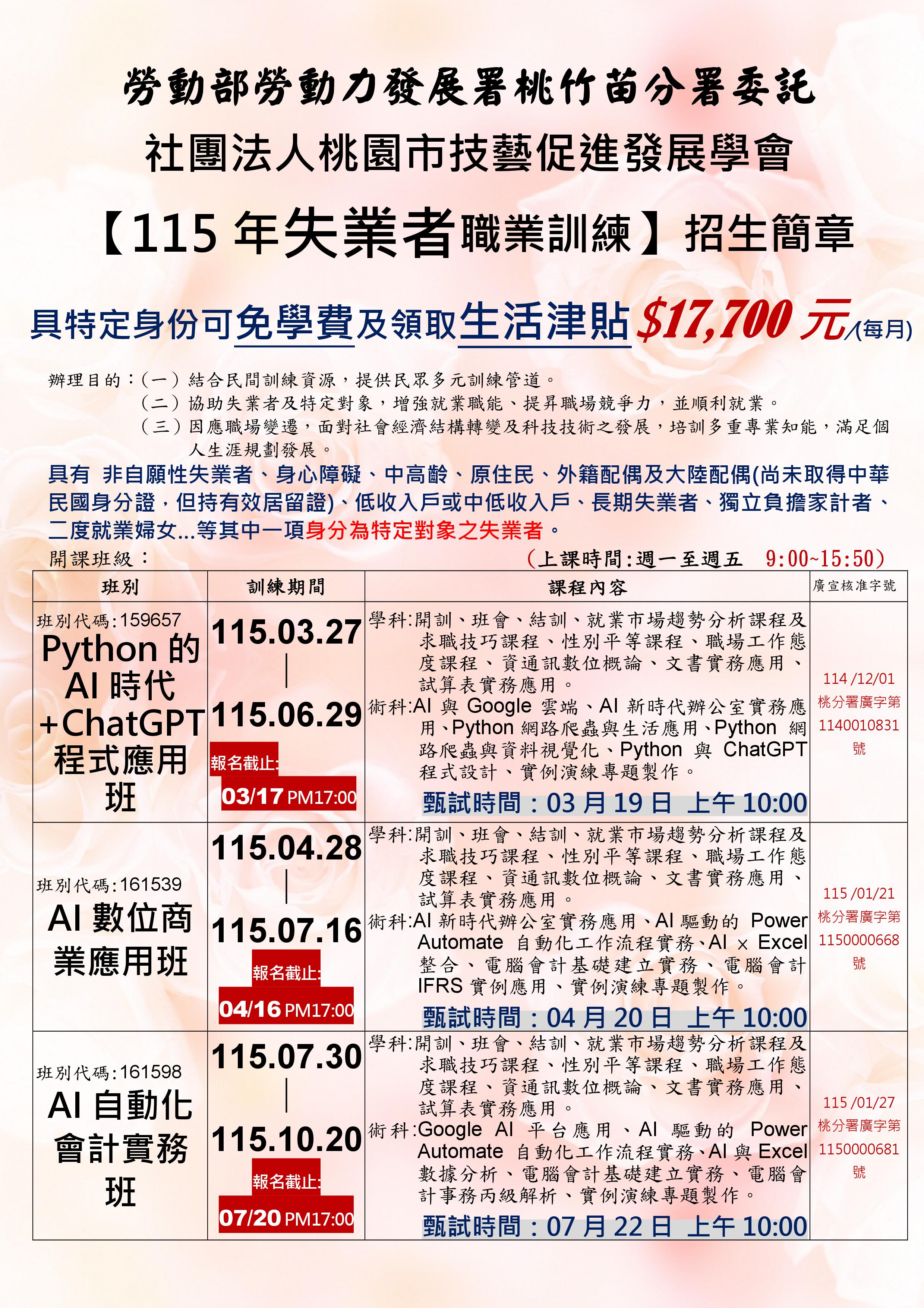 ![]() | 115年失業者職前訓練『Python的AI時代+ChatGPT程式應用班』招生中...