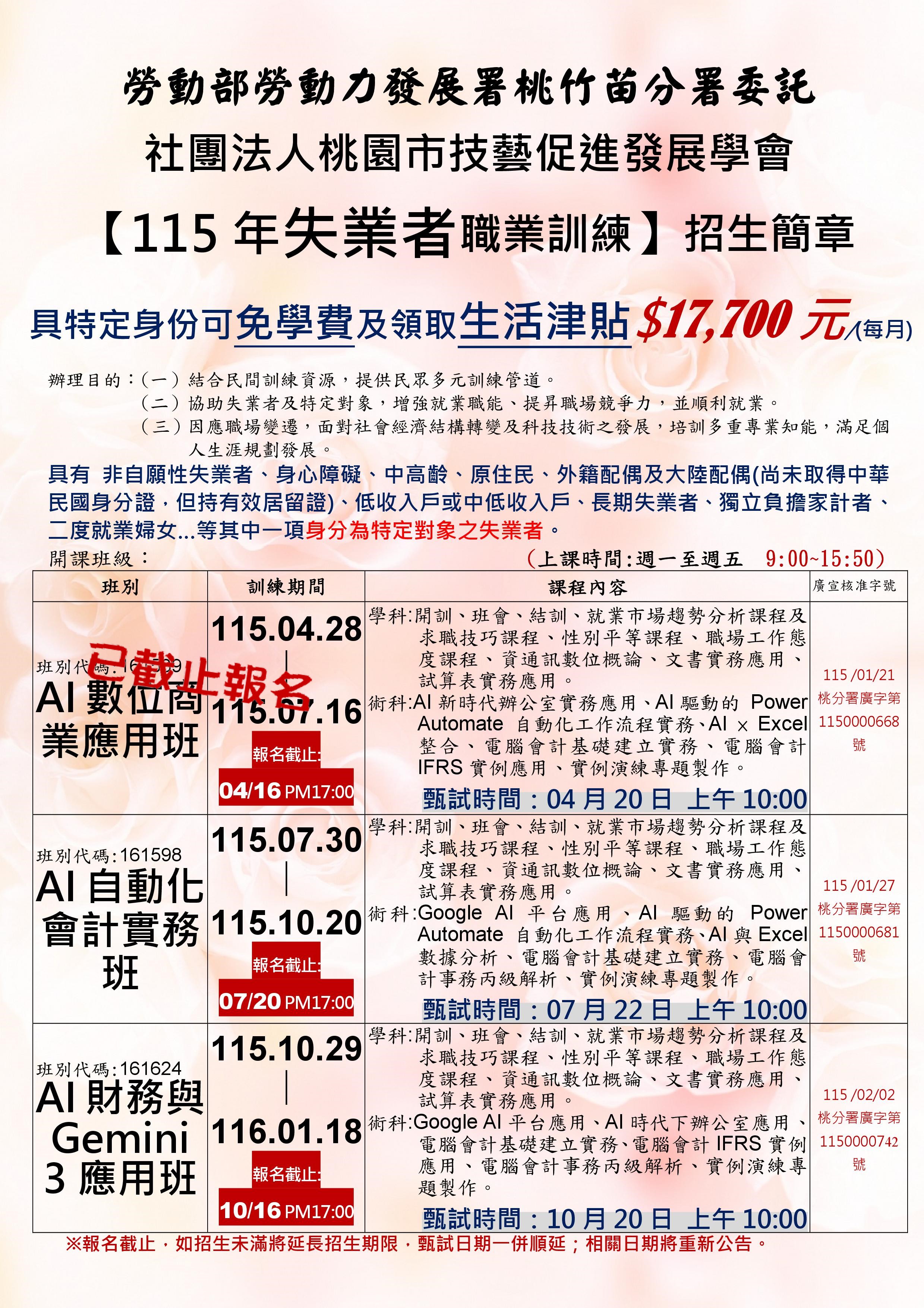 訓練期間從115/04/28~115/07/16,報名截止日期為115/04/16 下午5點止。 欲參訓者請儘快報名喔!03-4265312、0965-336826 |