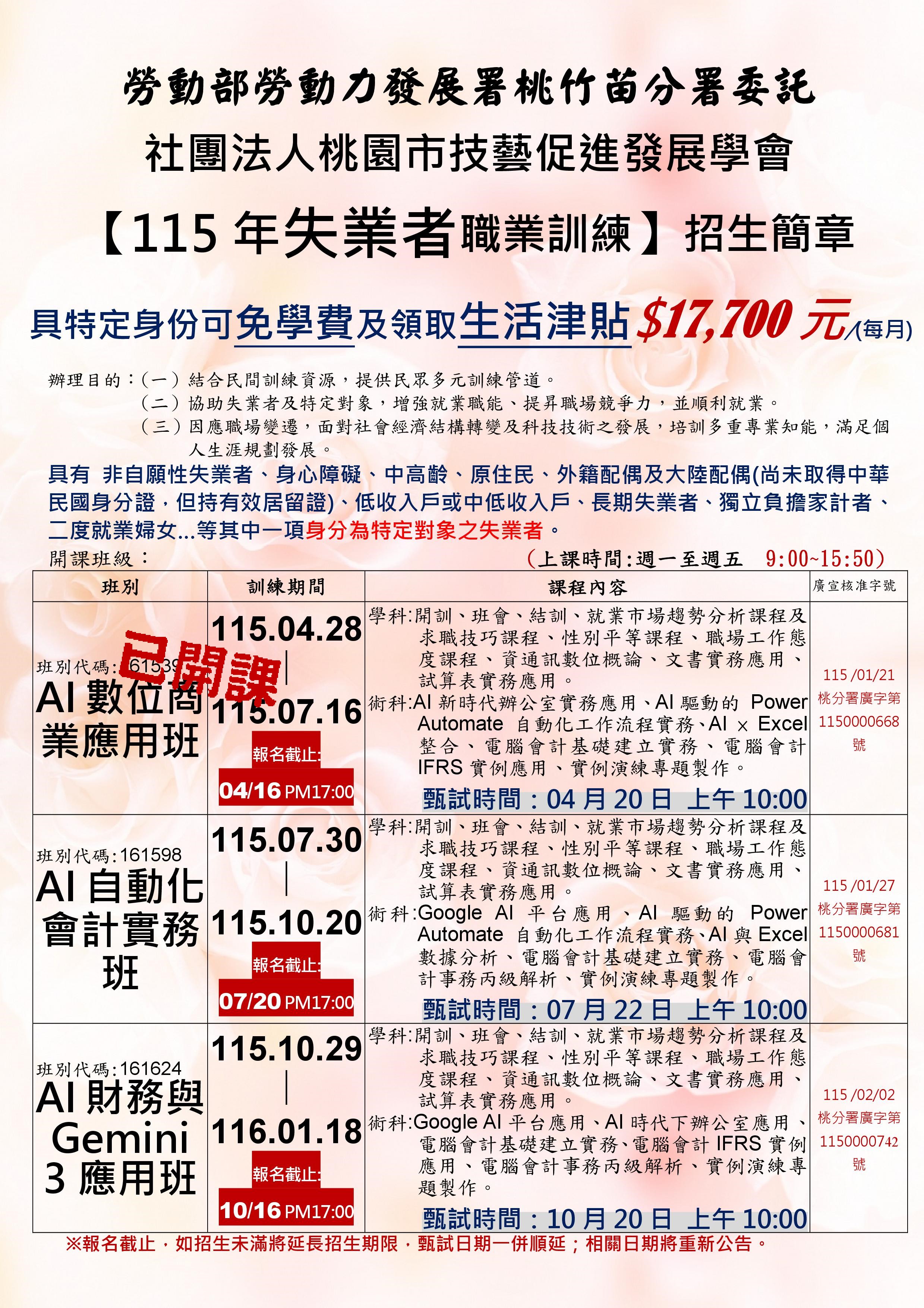 | 115-03-18 | 115年失業者職前訓練『AI數位商業應用班』招生中...
